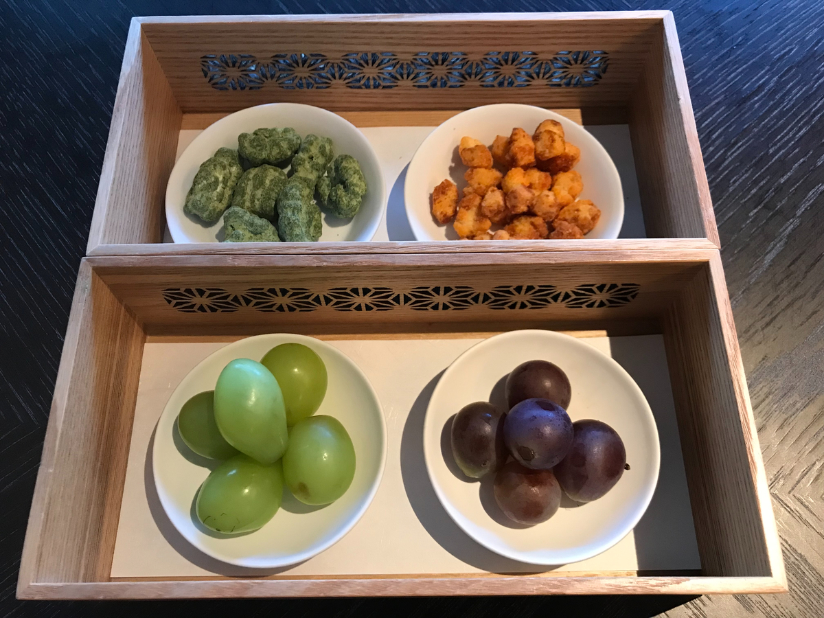 ウエルカムスイーツの小箱の御開帳です。抹茶チョコがけの胡桃とピリ辛おかき。ブドウ2種類です。巨峰なのでしょうか、黒ブドウは味が今ひとつ(劣化)で残念。