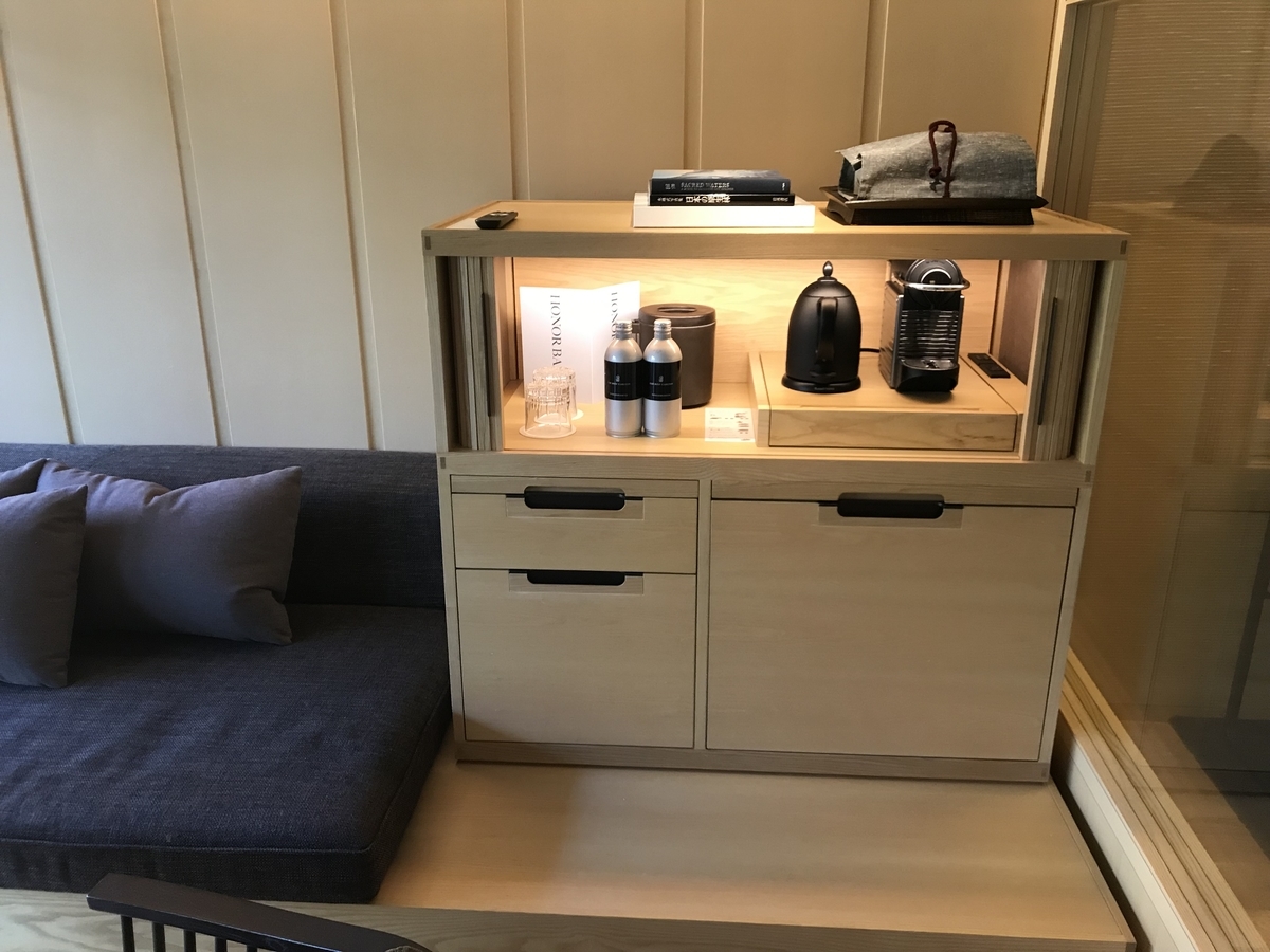 ミニバーコーナー。ネスプレッソのほか、紅茶や日本茶もあります。冷蔵庫の中は備え付けのドリンク類が占めています。わずかですが持ち込みのドリンクを冷やすスペースもあります。ソムリエナイフのほかウイスキーグラス、ワイングラスにシャンパングラスもあり、部屋で持ち込んだアルコールを楽しむのにもうってつけです。
