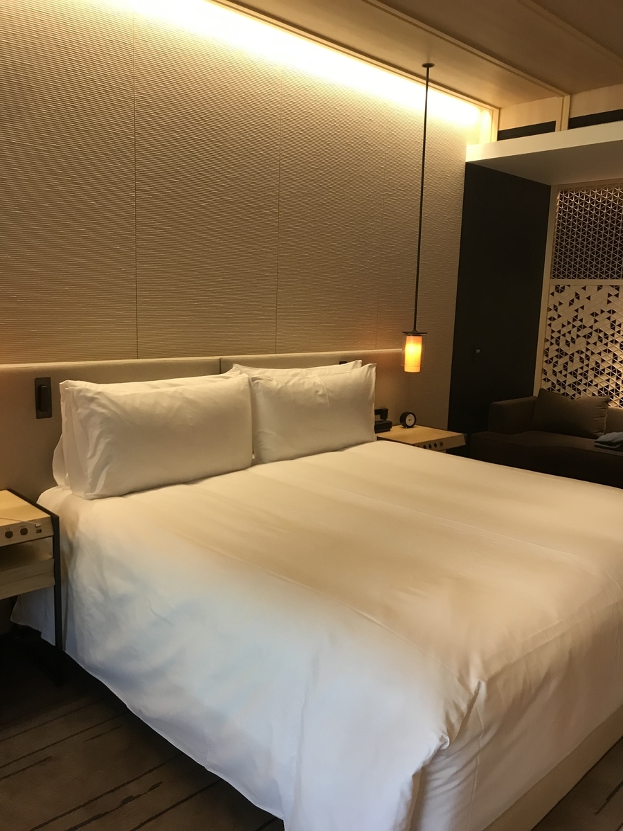 ベッドはキングサイズ。程よくふかふかで最高の寝心地。マリオットボンヴォイホテルの中で一番お気に入りのベッドです。ベッド両サイドのテーブルにあるスイッチで、照明の調節やカーテンの開閉などを全てコントロールできます。