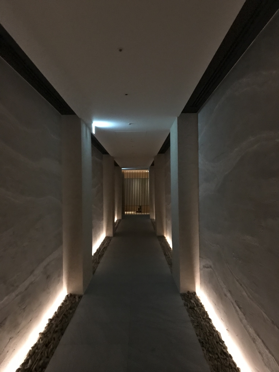 温泉大浴場へと続く廊下。灯りが幻想的です。ザ・リッツ・カールトン日光の温泉は硫黄の香り漂う白濁の湯温泉好きにはたまりません。