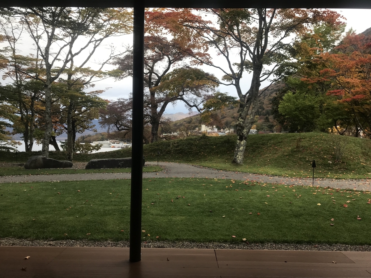 案内いただいたのは窓側席。窓の外には庭と紅葉が。その奥には中禅寺湖も見えています。席は予めリクエストしていました。